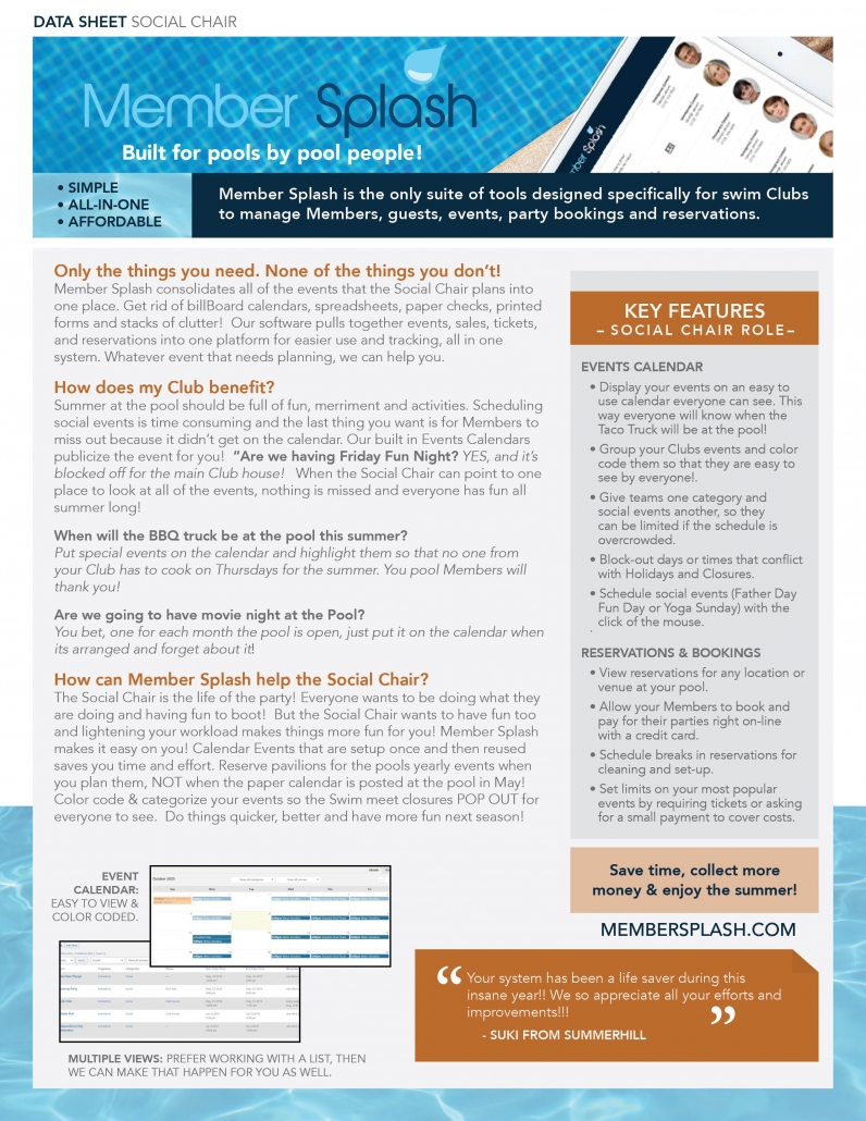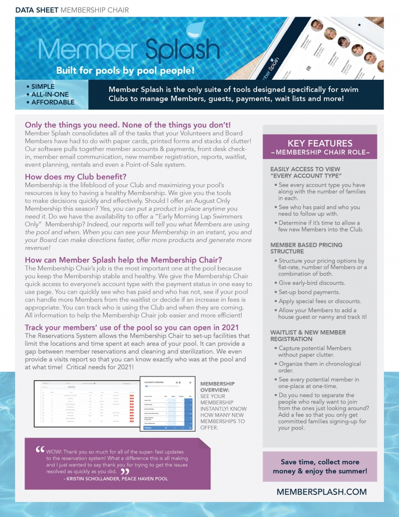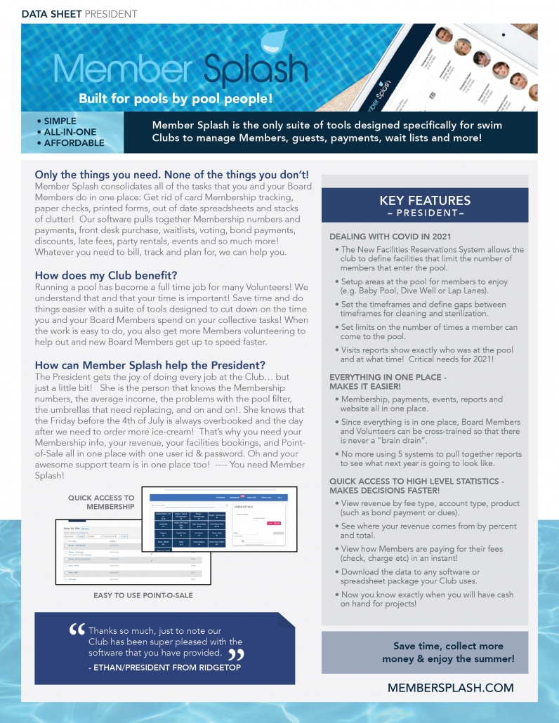 Let’s all dance to the same tune! Your board needs to work like a well-oiled machine and we give you that power. Save money, prepare for Covid in 2021, see how your revenue is shaping up, track your bonds, sell your tennis supplies, give “early bird discounts” or impose late fees. All of this from one system. Download the Members Splash Overview or the PDF for your Role to see how much easier we can make your volunteer job!
